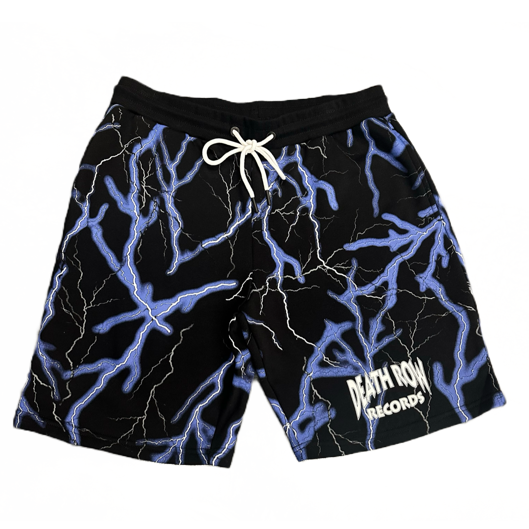 Death Row Lightning shorts feature a lightning print throughout short with a Death Row Records core logo at front. Front also features drawstrings and pockets. Back of Joggers feature one singular pocket.